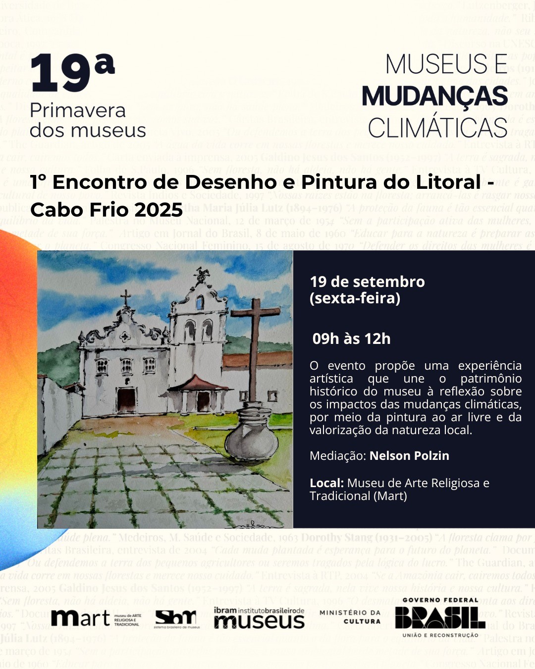 O Museu de Arte Religiosa e Tradicional(Mart/Ibram) de Cabo Frio promoverá, entre os dias 19 e 26 de setembro, a partir das 9h, a 19ª Primavera dos Museus. Entre as ações, estão previstas atividades como aula de yoga, oficinas de pintura, mesa de debates, exposição fotográfica e uma apresentação musical. Toda a programação é gratuita e aberta ao público.