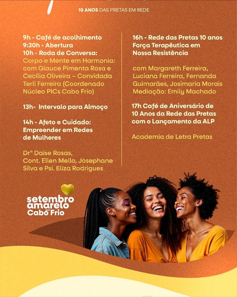O Palácio das Águias, em Cabo Frio, será palco neste sábado (27) do V Encontro das Pretas, evento voltado para mulheres negras que reúne debates, rodas de conversa e momentos de acolhimento. A programação integra o Setembro Amarelo, reforçando a valorização da vida e o cuidado com a saúde emocional