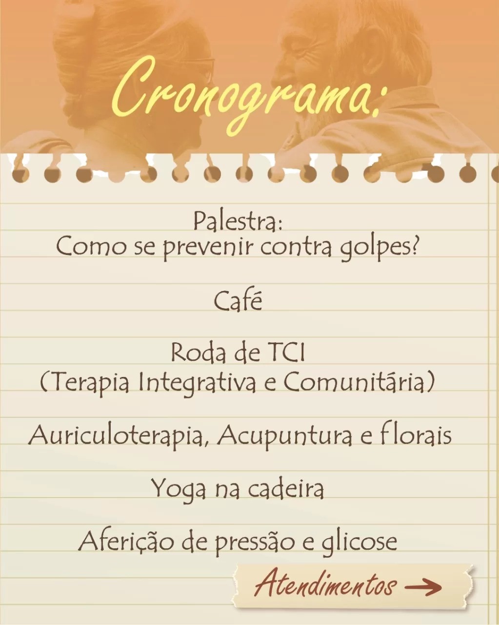A partir das 15h30, haverá atendimentos do Núcleo PICS (Práticas Integrativas e Complementares em Saúde), com auriculoterapia, acupuntura e florais. No mesmo horário, será realizada a prática de yoga na cadeira, especialmente voltada para pessoas idosas, conduzida pelo professor Paulo Monteiro do Yoga PSI.