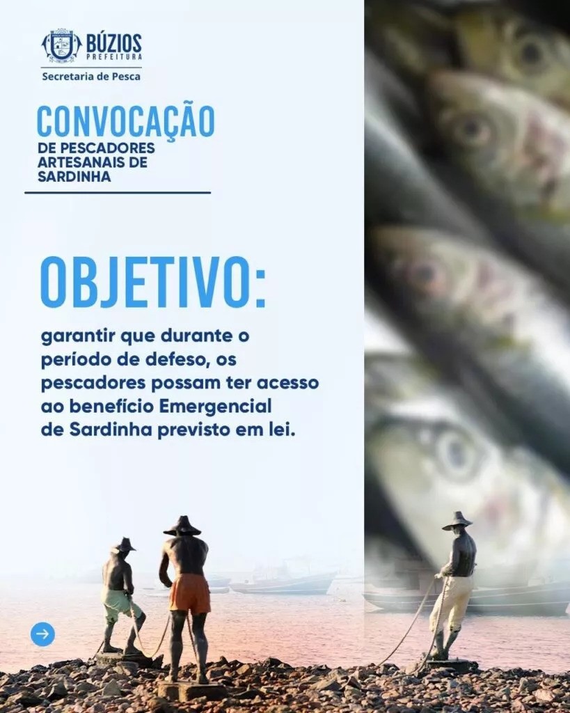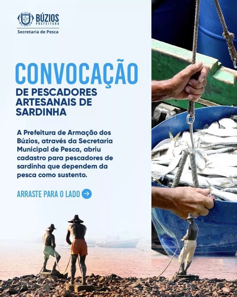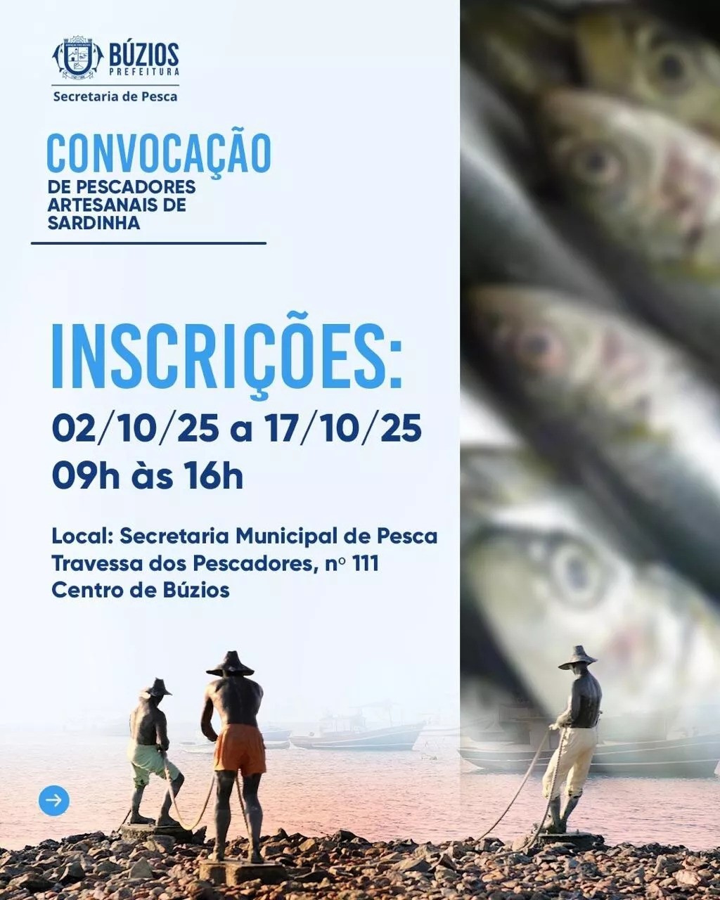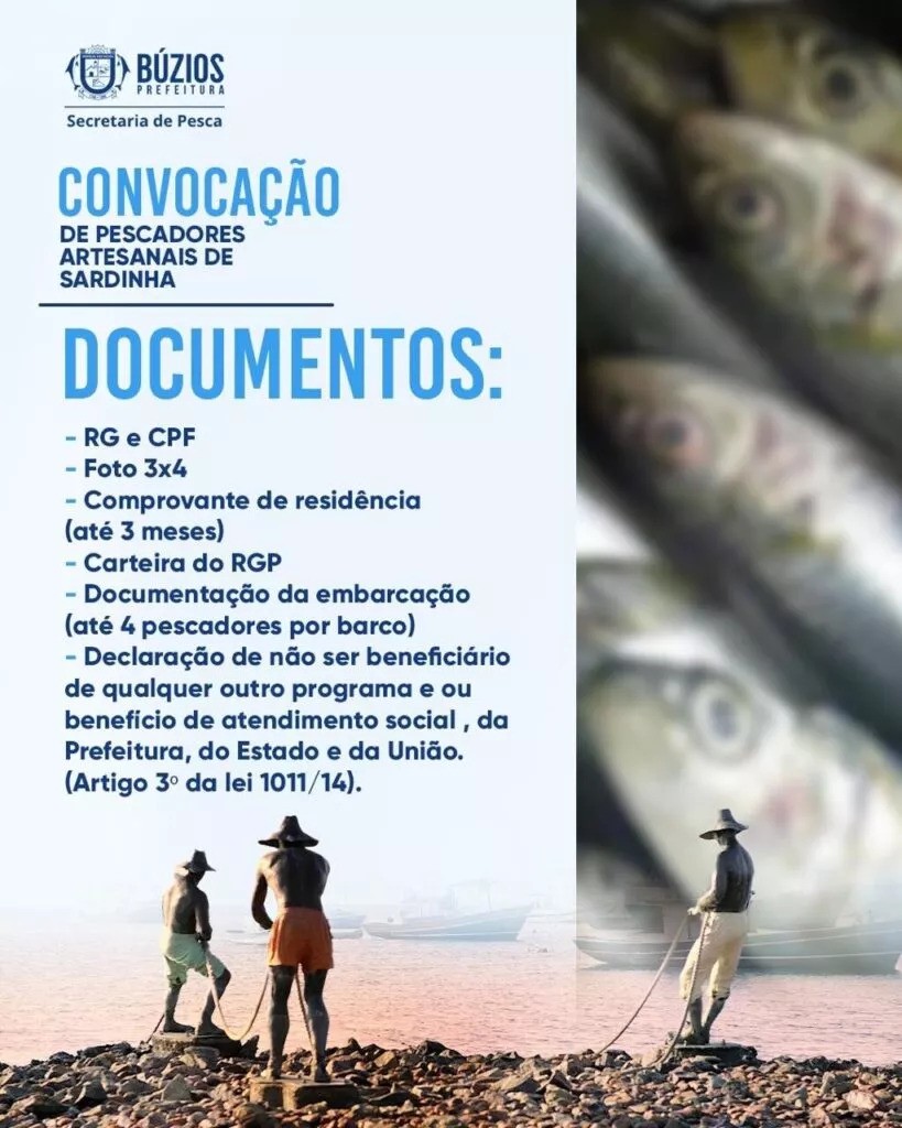 A Prefeitura de Armação dos Búzios, junto da Secretaria de Pesca, informa que esta é a última semana para o cadastramento do Auxílio Defeso da Sardinha, benefício destinado aos pescadores artesanais do município. O cadastramento permanecerá aberto até a próxima sexta-feira (17), com atendimento realizado das 9h às 16h, na Sede da Secretaria no Centro.