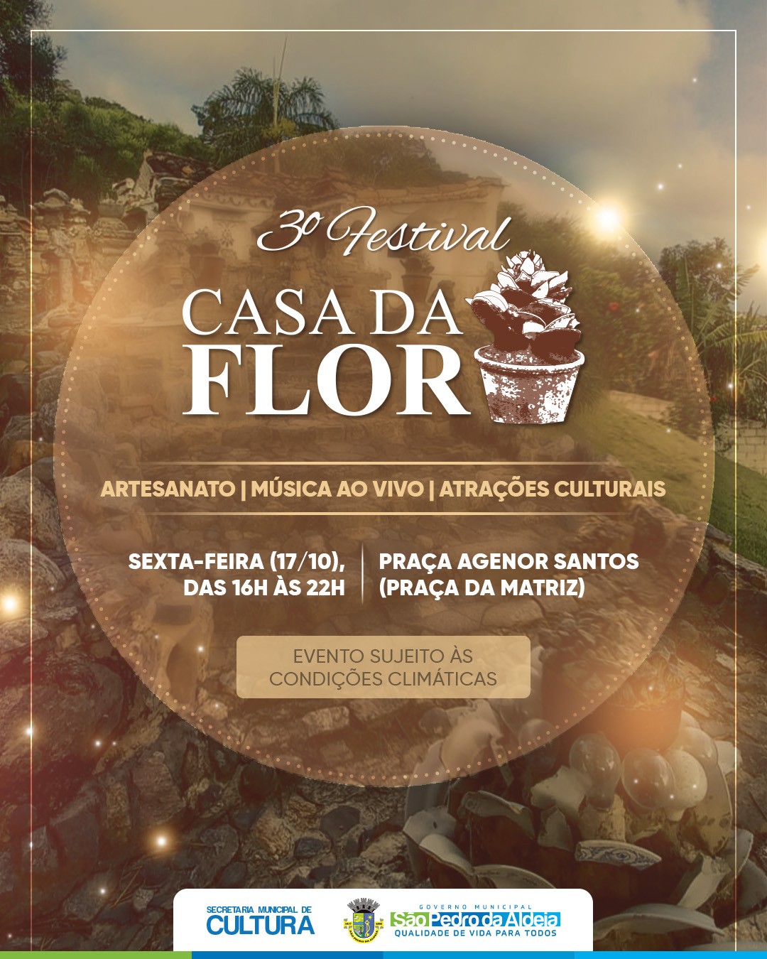 A Secretaria Municipal de Cultura de São Pedro da Aldeia realiza, nesta sexta-feira (17), o 3º Festival Casa da Flor, em comemoração aos 102 anos da Casa da Flor, um dos mais importantes patrimônios culturais e históricos da cidade. O evento acontece na Praça Agenor Santos (Praça da Matriz), no Centro, das 16h às 22h, com entrada gratuita e diversas atrações culturais.