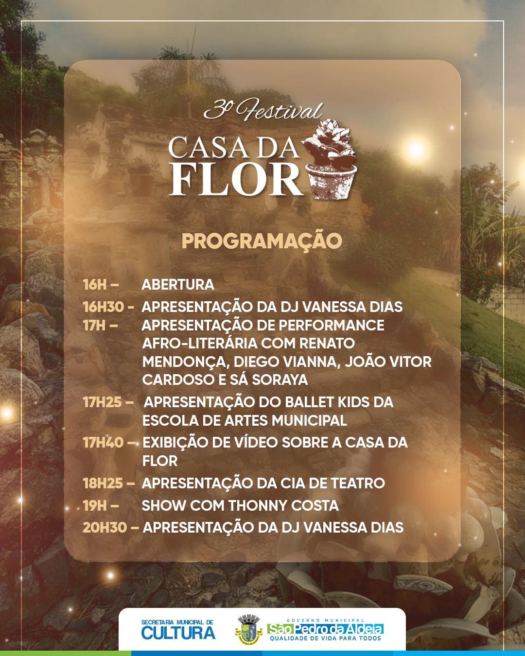 A partir das 17h, o público confere uma performance afro-literária com Renato Mendonça, Diego Vianna, João Vitor Cardoso e Sá Soraya. Em seguida, às 17h25, sobe ao palco o Ballet Kids da Escola de Artes Municipal, e às 17h40 será exibido um vídeo especial sobre a Casa da Flor.