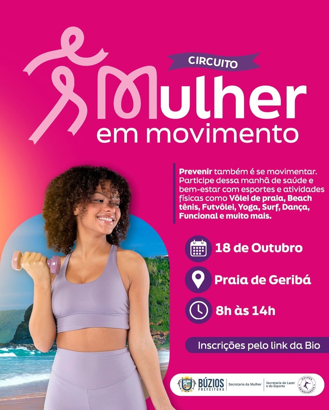 Um dos destaques da agenda é o Circuito Mulher em Movimento, marcado para o dia 18 de outubro, a partir das 8h, no canto direito da Praia de Geribá. O evento une esporte, autocuidado e valorização da mulher, com competições nas modalidades de vôlei de praia, queimado, beach tênis e futevôlei. Podem participar equipes com pelo menos uma mulher e integrantes a partir de 16 anos. As inscrições são gratuitas e podem ser feitas pelo formulário disponível em https://forms.gle/EfdkwpDKA4W6pmzEA.