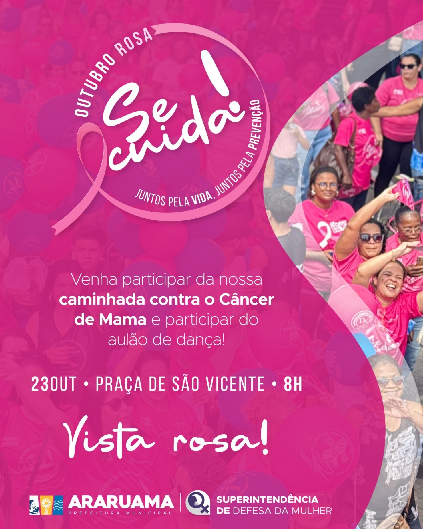 A Prefeitura de Araruama, por meio da Superintendência da Mulher, realiza nesta quinta-feira (23) a Caminhada do Outubro Rosa no distrito de São Vicente. A concentração será às 8h, na Praça de São Vicente, e a atividade faz parte da campanha mundial de conscientização sobre a prevenção e o diagnóstico precoce do câncer de mama e do colo do útero.