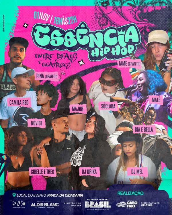 A cidade de Cabo Frio será palco, neste sábado (1º), da mostra “Essência Hip Hop – Entre Beats e Cicatrizes”, que transforma a Praça da Cidadania em um espaço de celebração da arte urbana e da representatividade. O evento, gratuito e aberto ao público, acontece das 16h às 22h, e promete reunir artistas de todo o estado do Rio de Janeiro em torno dos quatro elementos fundamentais do Hip Hop: DJ, MC, graffiti e dança.