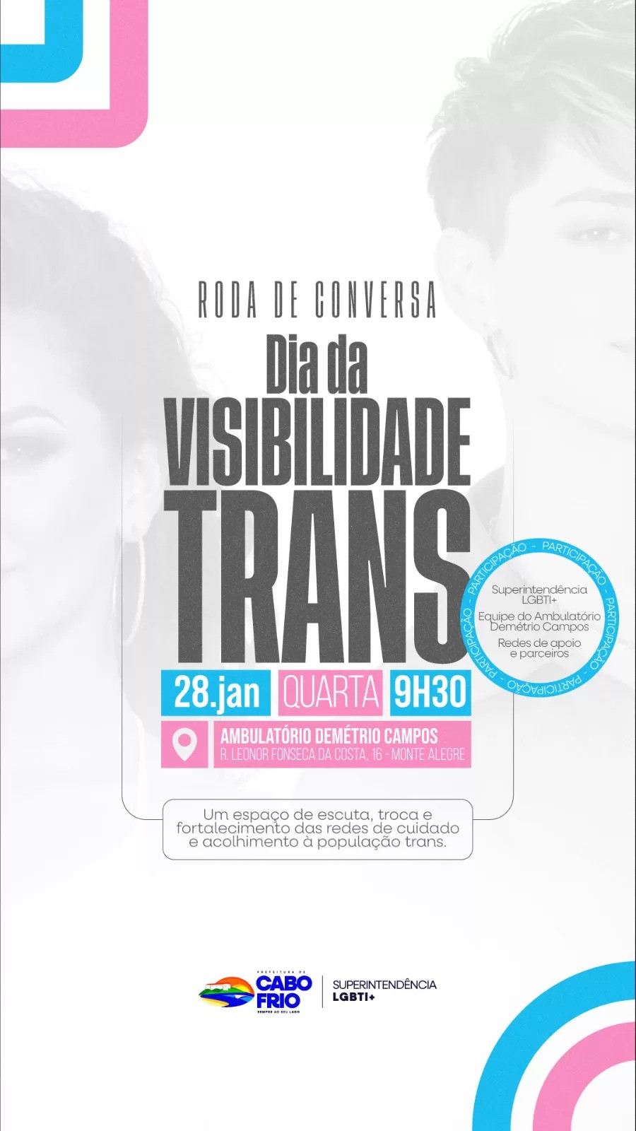 Em alusão ao Dia Nacional da Visibilidade Trans, celebrado na próxima quinta-feira (29), o Ambulatório Demétrio Campos, em Cabo Frio, promove uma roda de conversa com foco na reflexão, no acolhimento e na promoção do respeito às pessoas trans.
