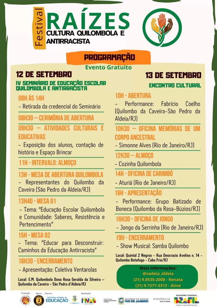 O Festival Raízes: Cultura Quilombola e Antirracista é fomentado pelo Governo Federal e pelo Ministério da Cultura, através da Secretaria de Cultura e Economia Criativa do Estado do Rio, com recursos da Lei Aldir Blanc.