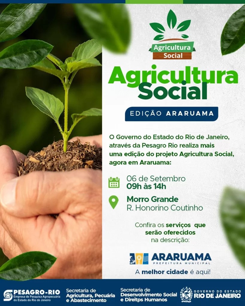 Araruama recebe no próximo sábado (6) a 7ª edição do Programa Agricultura Social, iniciativa do Governo do Estado do Rio de Janeiro em parceria com a Prefeitura. O evento será realizado das 9h às 14h, em Morro Grande, na Rua Honorino Coutinho, com entrada gratuita e programação aberta a toda a população.