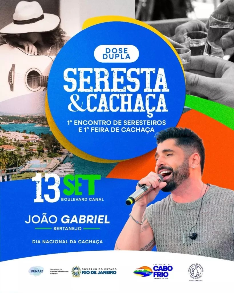 O sertanejo João Gabriel será a atração principal do evento “Dose Dupla: Seresta e Cachaça”, que acontece nos dias 12 e 13 de setembro, sempre a partir das 19h, no Boulevard Canal, em Cabo Frio. A programação reúne o 1º Encontro de Seresteiros e a 1ª Feira de Cachaça.