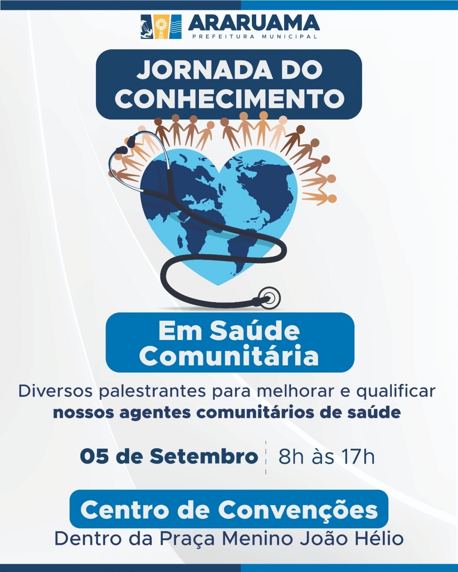 A Prefeitura de Araruama, por meio da Secretaria Municipal de Saúde, promove nesta sexta-feira (5) a Jornada do Conhecimento em Saúde Comunitária. O encontro será realizado no Centro de Convenções da Praça Menino João Hélio, a partir das 8h, reunindo agentes comunitários de saúde (ACS), profissionais da área e representantes de toda a rede municipal de atenção à saúde.