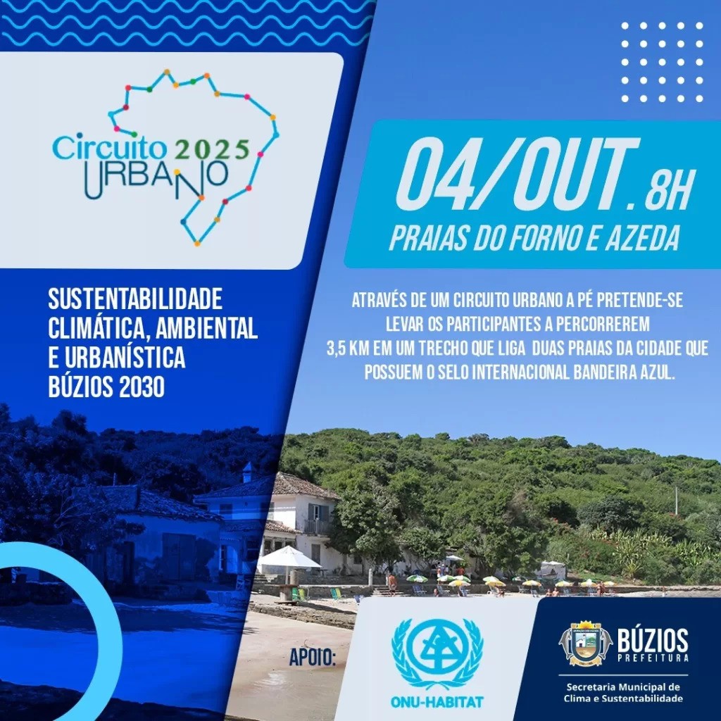 A Prefeitura de Búzios, junto da Secretaria do Clima e Sustentabilidade, promoverá no dia 4 de outubro, às 8h, o Circuito Urbano 2025, entre as duas praias que possuem o selo internacional Bandeira Azul: Forno e Azeda. A iniciativa tem como objetivo conscientizar a população dentro da linha de Ação Climática e Meio Ambiente Urbano do Ciclo Urbano 2025.