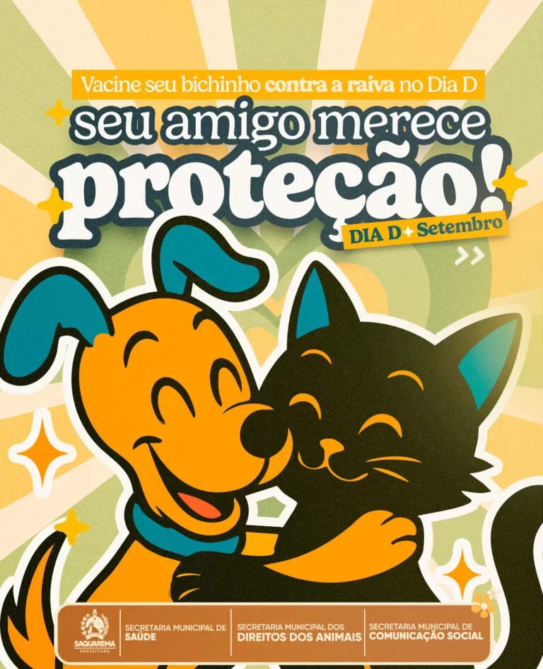 Neste sábado (27), a prefeitura de Saquarema promove o Dia D da Campanha de Vacinação Antirrábica. A ação, coordenada pela Secretaria Municipal de Saúde em parceria com as secretarias de Agricultura, Direitos dos Animais e Defesa Civil, acontecerá em diferentes pontos da cidade, com atendimento gratuito das 9h às 16h.