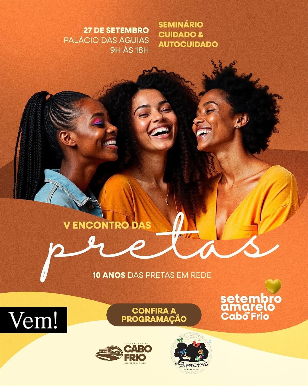 O Palácio das Águias, em Cabo Frio, será palco neste sábado (27) do V Encontro das Pretas, evento voltado para mulheres negras que reúne debates, rodas de conversa e momentos de acolhimento. A programação integra o Setembro Amarelo, reforçando a valorização da vida e o cuidado com a saúde emocional
