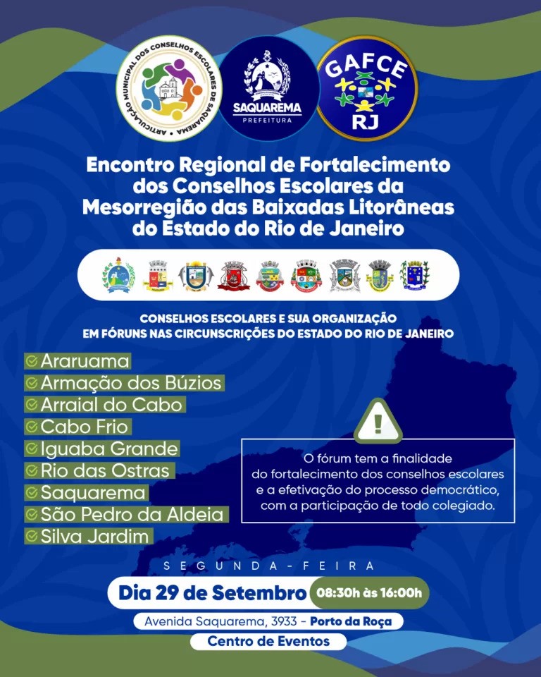 Na segunda-feira (29), Saquarema será sede do Encontro Regional de Fortalecimento dos Conselhos Escolares da Mesorregião das Baixadas Litorâneas do Estado do Rio de Janeiro. O evento acontece no Centro de Eventos, no bairro Porto da Roça, das 8h30 às 16h.