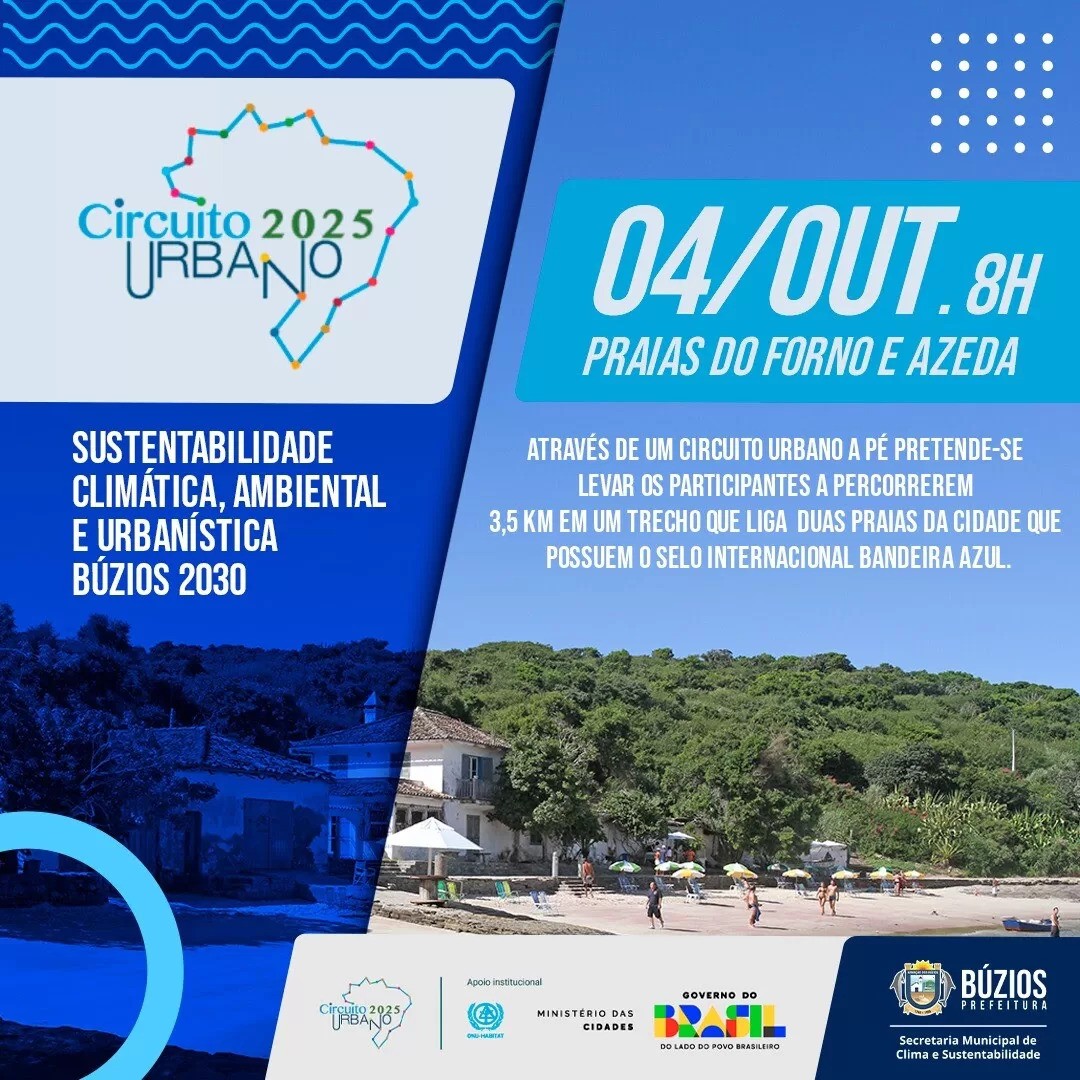 A Prefeitura de Búzios promove neste sábado (4), às 8h, o Circuito Urbano 2025, entre as duas praias que possuem o selo internacional Bandeira Azul: Forno e Azeda. A iniciativa tem como objetivo conscientizar a população, alinhando-se à linha de Ação Climática e Meio Ambiente Urbano do Ciclo Urbano 2025.