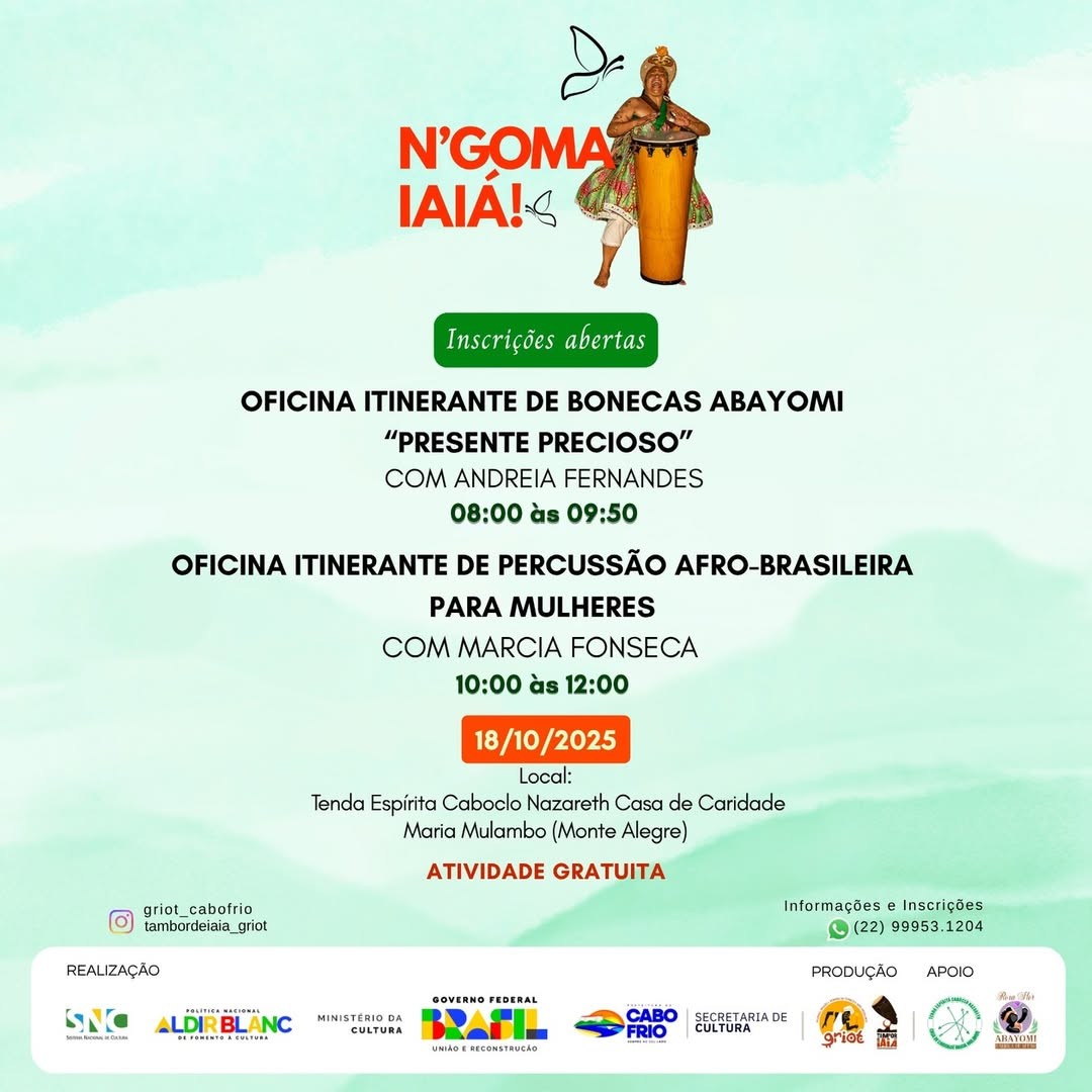 O Ponto de Cultura e de Memória Coletivo GRIOT realiza, no próximo dia 18 de outubro, o projeto N’GOMA IAIÁ!, aprovado no Edital de Chamamento Público nº 04/2025, com recursos da Lei Aldir Blanc – PNAB (Lei nº 14.399/2022), do Governo Federal e do Ministério da Cultura.