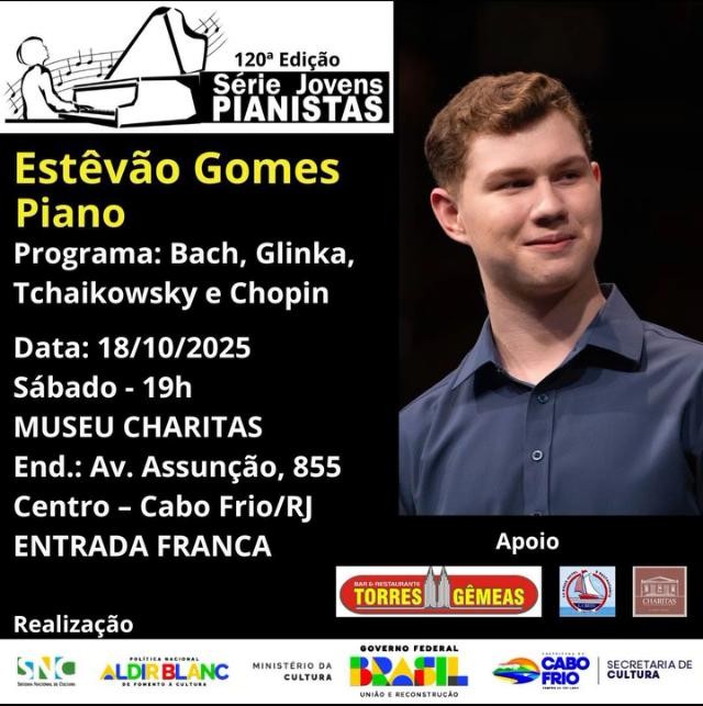O Museu Charitas, localizado na Avenida Assunção, 855, Centro – Cabo Frio/RJ, receberá no próximo dia 18, ás 19h a 120ª edição da Série Jovens Pianistas, recebendo o pianista Estêvão Gomes.