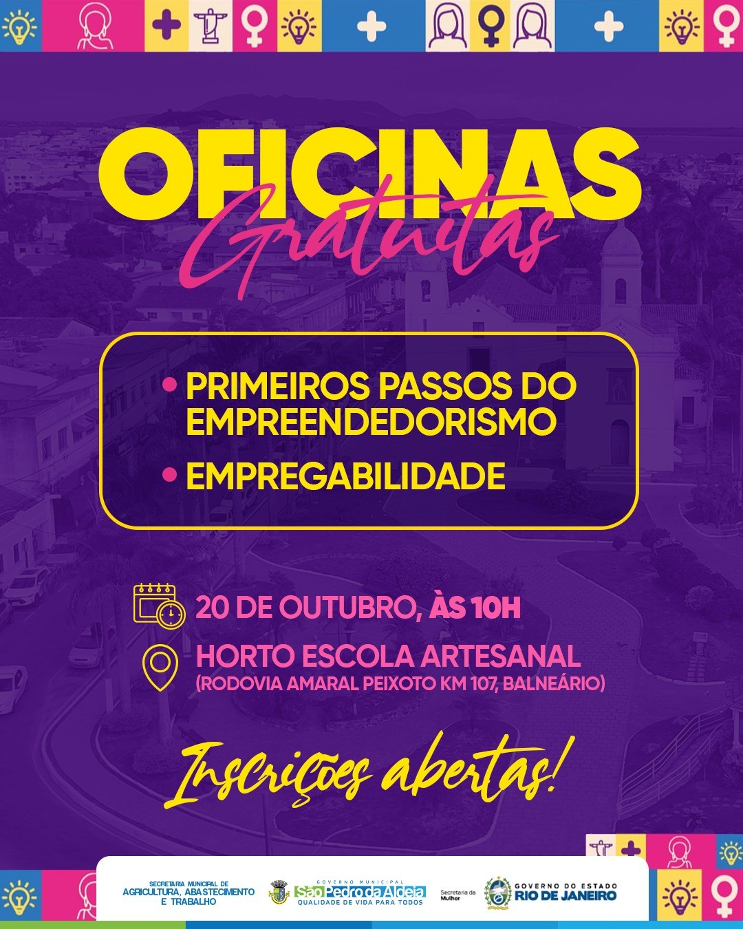 As moradoras de São Pedro da Aldeia ainda têm a oportunidade de participar das oficinas gratuitas de empreendedorismo feminino, com foco na inserção produtiva e no fortalecimento da autonomia econômica. As inscrições seguem abertas para as oficinas “Primeiros passos para o empreendedorismo” e “Empregabilidade”. A iniciativa é fruto de uma parceria entre a Secretaria de Agricultura, Abastecimento e Trabalho e a Secretaria de Estado da Mulher do Rio de Janeiro. O encontro será realizado na próxima segunda-feira (20), a partir das 10h, no Horto Escola Artesanal.
