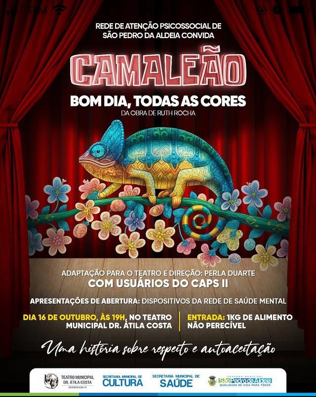 A celebração contará com a apresentação da peça “Camaleão”, adaptação da obra de Ruth Rocha dirigida pela teatróloga Perla Duarte. A encenação, feita pelos usuários do CAPS, aborda temas como respeito, diversidade e autoaceitação, destacando a arte como instrumento de expressão, inclusão e cuidado.