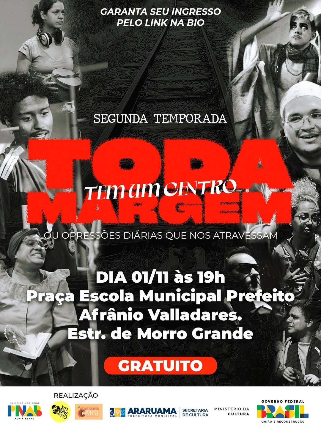 A segunda temporada do espetáculo “Toda Margem Tem um Centro” será apresentada nesta sexta-feira, 1º de novembro, às 19h, na Praça da Escola Municipal Prefeito Afrânio Valladares, em Itatiquara, Araruama. A entrada é gratuita, com apenas 30 vagas por sessão, e a classificação indicativa é 16 anos.