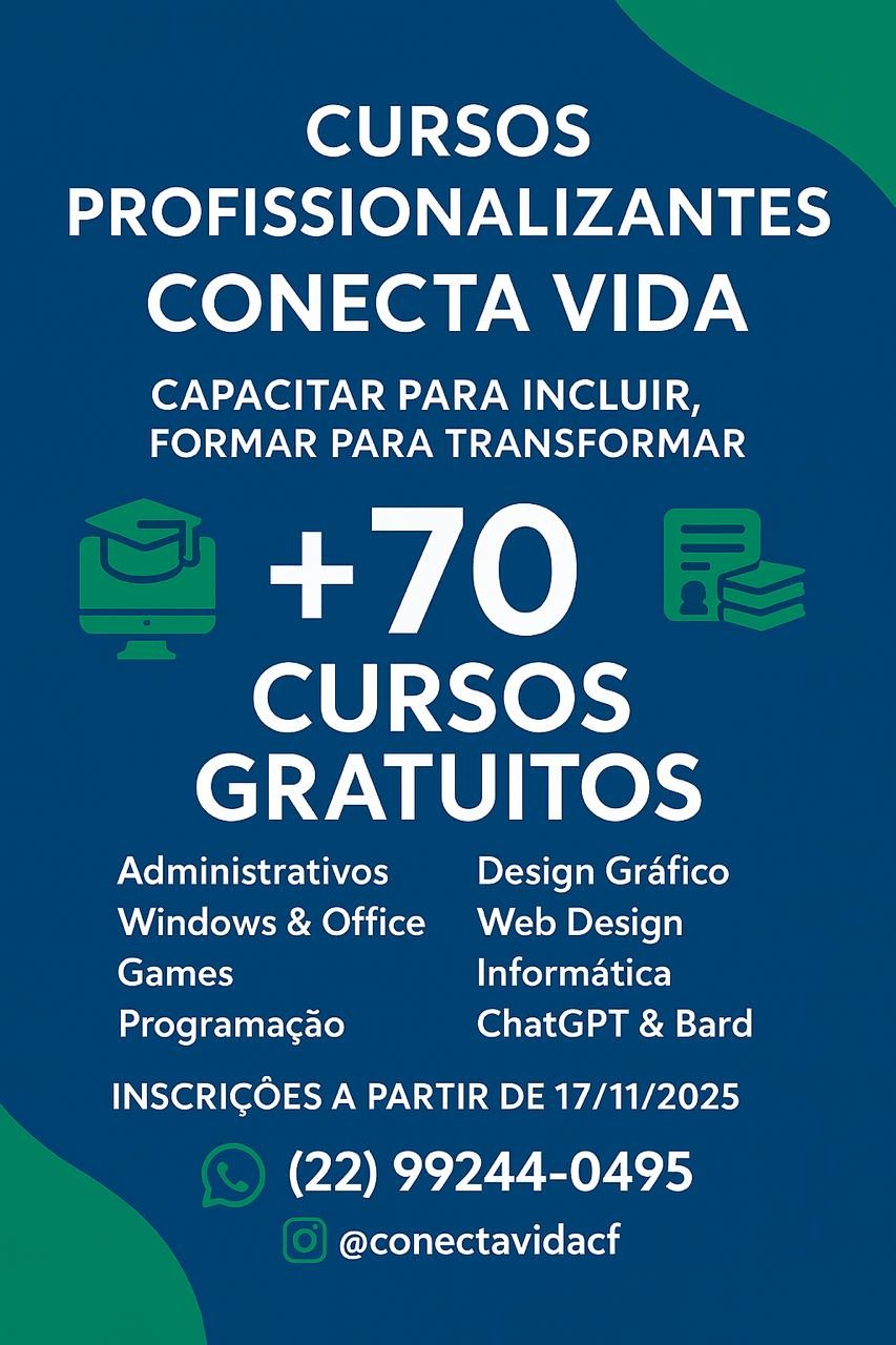 Mais do que um espaço físico, a Conecta Vida é um ponto de encontro entre educação, cultura, esporte e solidariedade. A iniciativa vai oferecer mais de 70 cursos gratuitos, oficinas culturais, atividades esportivas e ações voltadas à tecnologia e qualificação profissional, abrindo novas portas para jovens e famílias do bairro.