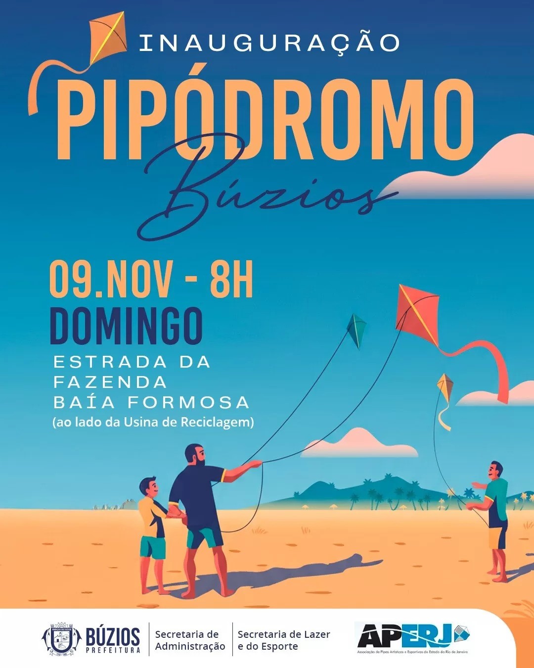 A Prefeitura de Búzios, junto da Secretaria de Administração, em parceria com a Secretaria de Lazer e do Esporte e a Associação de Pipas Artísticas e Esportivas do Estado do Rio de Janeiro (APERJ), inaugura neste domingo (9), às 8h, um novo espaço dedicado à prática recreativa com pipas. O local fica na Estrada da Fazenda, em Baía Formosa, ao lado da Usina de Reciclagem.