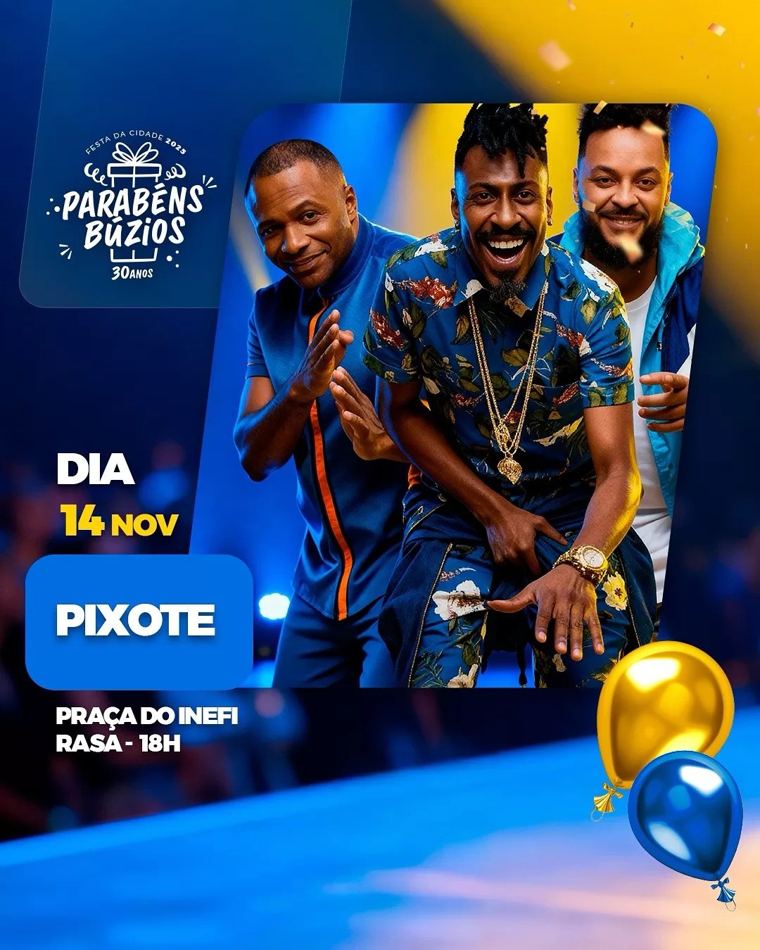 As comemorações pelos 30 anos de emancipação política de Búzios seguem a todo vapor! Nesta sexta-feira (14), quem sobe ao palco na Praça Tia Uia, no bairro da Rasa, é o grupo Pixote, um dos maiores nomes do pagode nacional. O show, com entrada gratuita, promete uma noite cheia de energia, romance e muita música boa, reunindo moradores e visitantes em um grande momento de celebração e alegria.