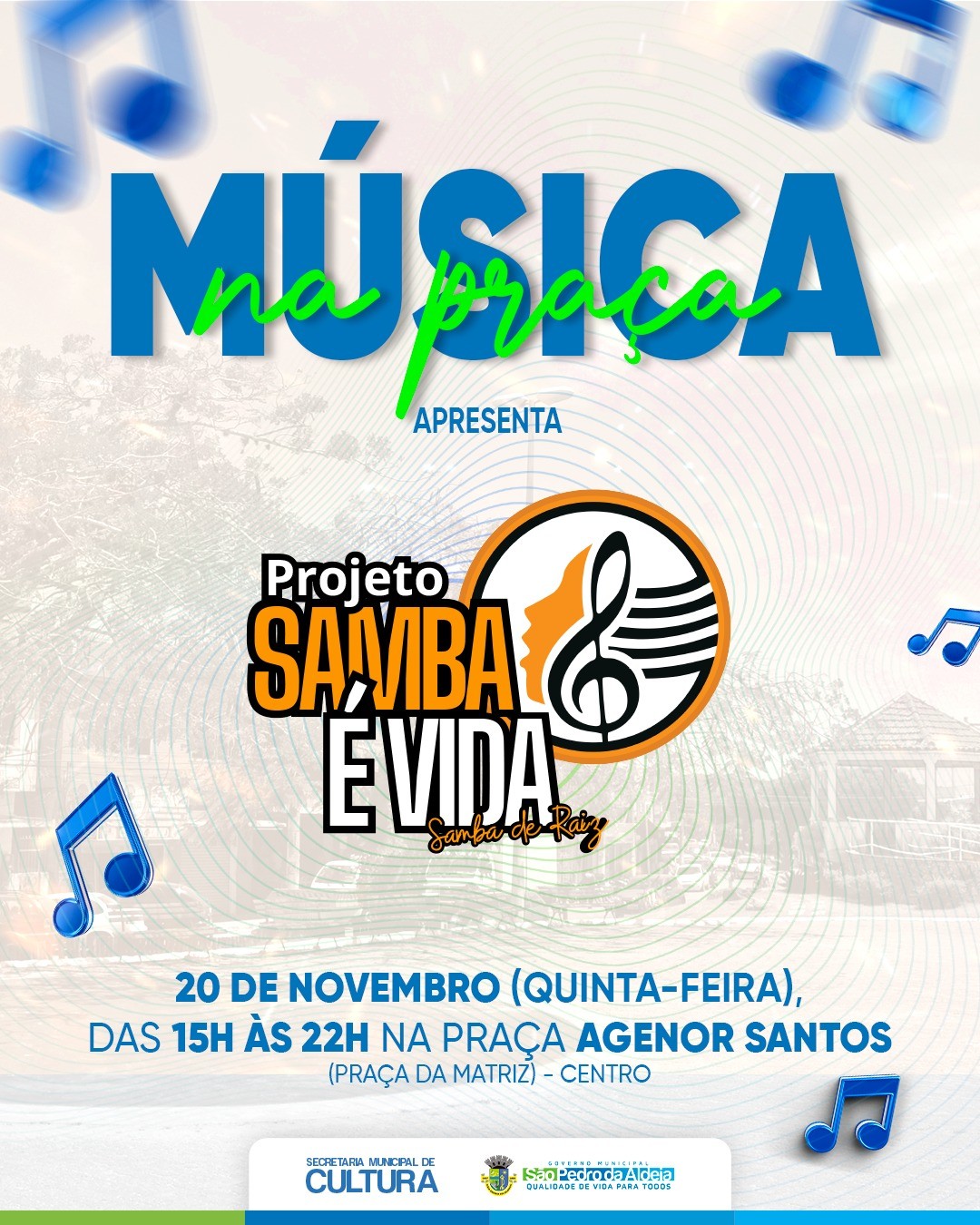 Roda de samba comandada pelo Projeto Samba É Vida anima a Praça da Matriz em São Pedro da Aldeia no dia 20 de novembro, das 15h às 22h.