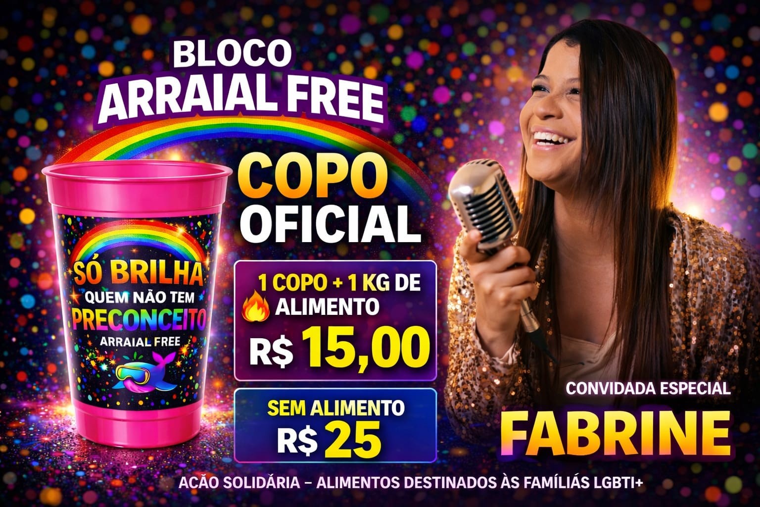 Durante o evento, o público poderá adquirir o copo oficial do bloco pelo valor de R$ 15, mediante a doação de 1 quilo de alimento não perecível. Todos os alimentos arrecadados serão destinados a famílias LGBTI, reforçando o compromisso social da iniciativa com o enfrentamento das desigualdades e o fortalecimento comunitário.